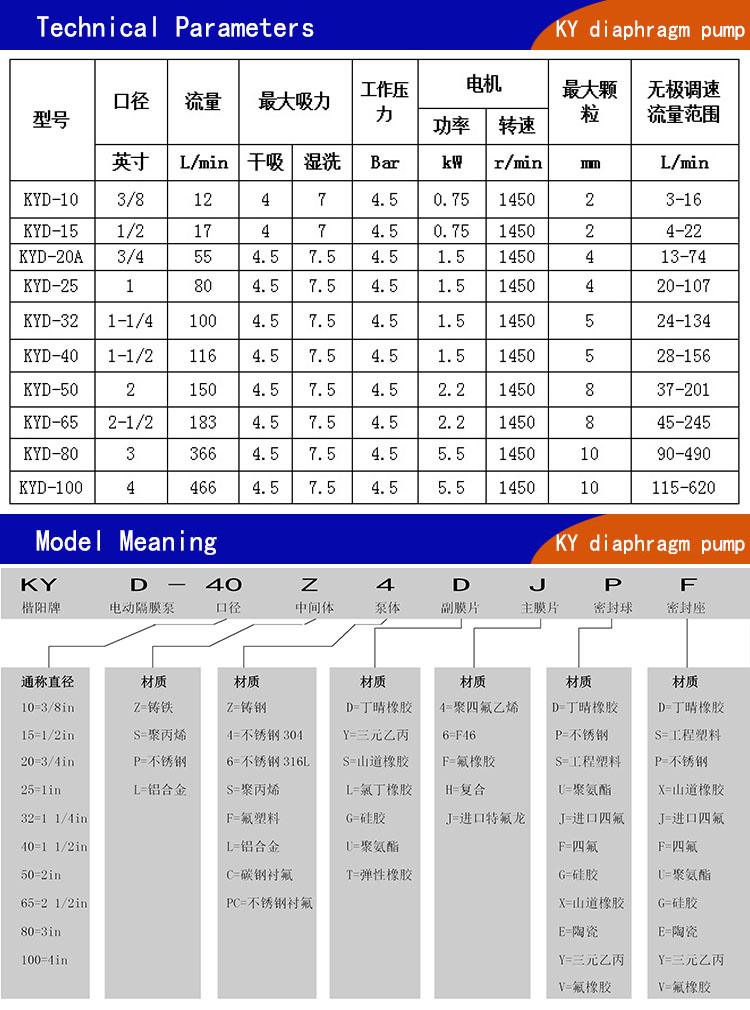由于隔膜將被輸送介質和傳動機械件分開,所以介質絕對不會向外泄漏;且KYD隔膜泵品牌產品本身無軸封,使用壽命大大延長; | ||
