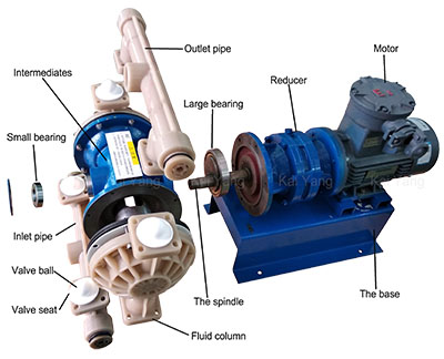 KYD電動氟塑料隔膜泵的源動力是由西門子貝德電機給予,電機通過減速機帶動泵體左右兩端連桿軸上的隔膜片左右往復(fù)運動。在左右兩個泵腔里裝有上下四個單項球閥,隔膜片的左右運動使泵腔內(nèi)的容積產(chǎn)生有規(guī)律的改變。迫使四個單項球閥交替的開啟和關(guān)閉,從而將液體吸入和排出產(chǎn)生流體。隔膜泵電動型是上海楷陽電動隔膜泵廠家開發(fā)的新一代耐腐蝕隔膜泵,具有質(zhì)量可靠使用壽命長、噪音底、震動小、耐腐蝕、做工精細(xì)等六大優(yōu)點,是目前國內(nèi)最新穎的一種電動氟塑料隔膜泵。上海楷陽電動耐腐蝕隔膜泵材質(zhì)齊全,膜片、球、球座采用耐腐蝕強彈性好的 F46(聚全氟乙丙烯FEP或者 F46,是四氟乙烯和六氟丙烯的共聚物)材質(zhì),對于各種腐蝕性液體,帶顆粒的液體,高粘度、易揮發(fā)、易燃、劇毒的液體,均能予以抽 光吸盡。其性能參數(shù)與聯(lián)邦德國WLLDENPVMPS、美國的MARIOWPUMPS相近。
