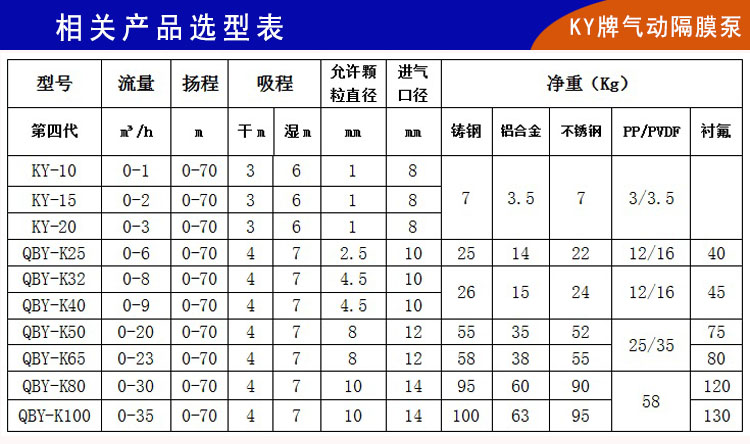 3、第四代QBY-K聚丙烯氣動隔膜泵可以根據客戶不同需求,配山道橡膠、特氟龍F46等材質隔膜片。對任何酸堿性、油性、中性液體均可以適應。