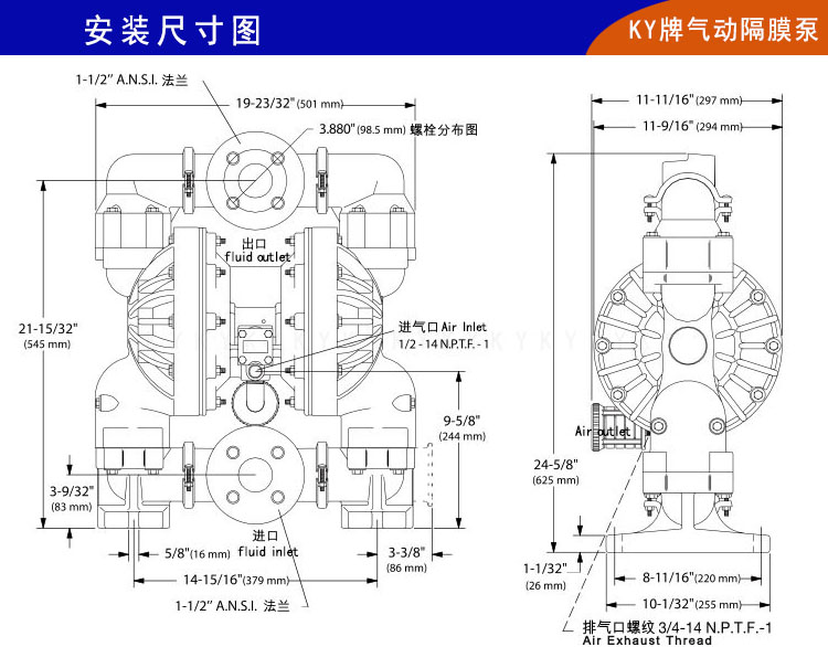 11)、KY氣動隔膜泵可以生產多種材質泵體,具有良好的抗腐蝕性,適用于各種介質